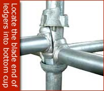 The success of cuplock lies in the node point or fastening method. Four horizontal can be fastened at one time making a very rigid connection. The horizontal bear directly on the verticals and are firmly clamped by the action of the cup. There are no loose parts to lose. The rigid node point allows for high horizontal loads experienced with a 57kN leg load..